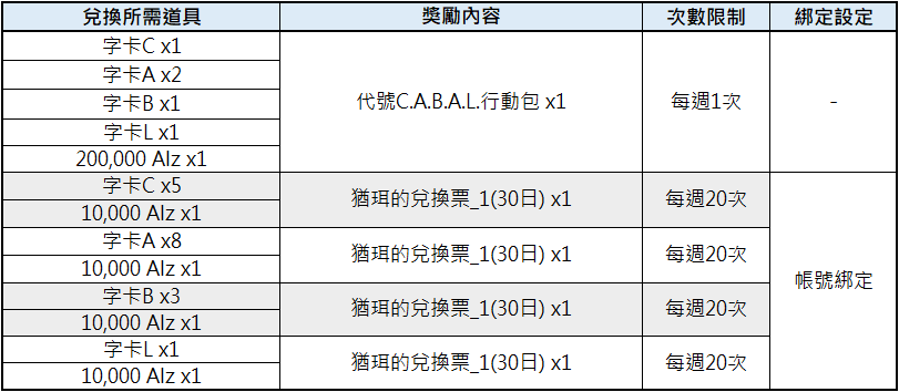1. 未使用的活動道具「字卡C」、「字卡A」、「字卡B」、「字卡L」、「代號C.A.B.A.L.行動包」將於2025/09/30(二) 12:00活動結束後統一刪除,請戰士們把握時間盡速兌換及使用完畢。