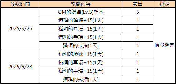 2.全服發送獎勵領取期限為2025/09/30(二) 中午12:00前,請於時間內盡速領取完畢。
