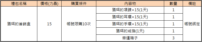 3. 本活動販售之部分商品有綁定、購買次數、等級、使用期限等限制,請留意公告內文及表格中說明。