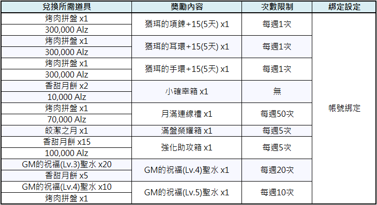 2. 部分獎勵設有每周或每日帳號兌換次數限制,每周兌換限制將於週二中午12:00重置次數。