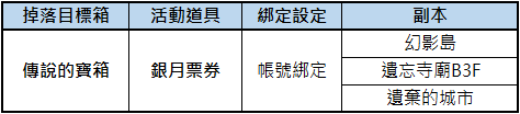 活動期間內,完成指定副本可從傳說箱子開啟獲得「銀月票券」。
