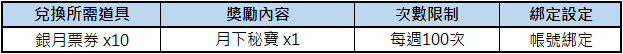 1. 「銀月票券」、「月下秘寶」為活動性質道具,若未於活動期間內使用完畢,視同放棄權益,將於2025/10/28(二) 維護期間由系統統一回收。