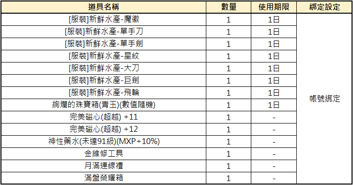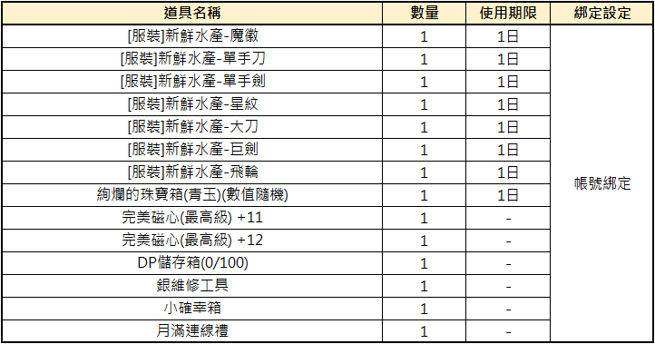 2. 獎勵獲取的道具可能有等級、綁定、時效等限制,實際道具設定以遊戲中獲取為準。