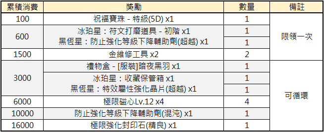4. 消費金額超過16,000以上時,將從消費3000黑魂獎勵重新開始循環。例如:若某玩家消費達19,000黑魂,將可領取3000黑魂獎勵兩次,其餘獎勵一次。