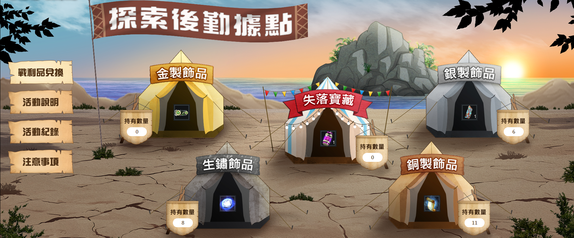 3. 進行探索時,將依照機率獲得不同階級的戰利品,等級由低至高排序為生鏽飾品、銅製飾品、銀製飾品、金製飾品、失落寶藏,這些戰利品可用於對應的交易後勤進行商品購買。