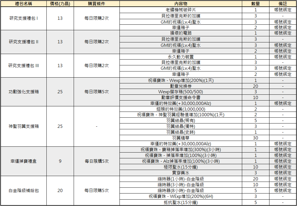1. 本活動販售之部分商品有綁定、購買次數、等級、使用期限等限制,請留意公告內文及表格中說明。