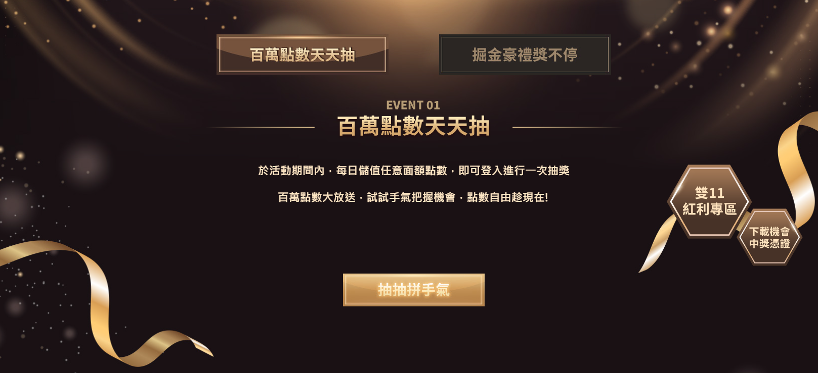 3.「掘金豪禮獎不停」採累積儲值金額為判斷依據,每一會員帳號不限參加活動次數,中獎夢享幣將即時計入持有數量,紅利點數將自動入點至雙11紅利專區。