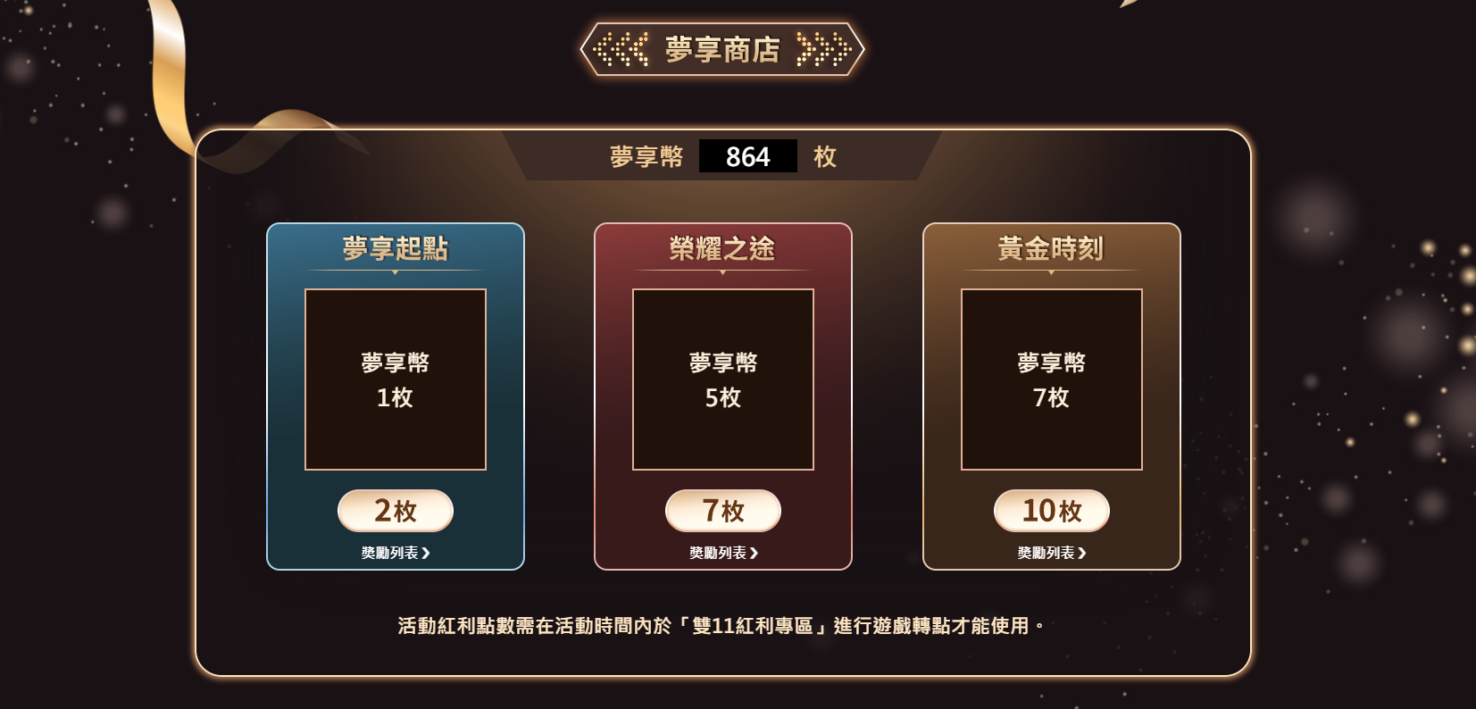 7.夢享商店部分獎項為活動期間內及每天限量兌換,每天限量獎項將於每天00:00重置可兌換次數。