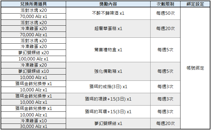 2. 部分獎勵設有每周或每日帳號兌換次數限制,每周兌換限制將於週二中午12:00重置次數。