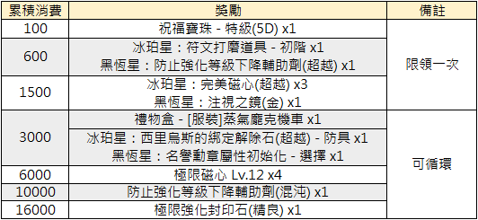 4. 消費金額超過16,000以上時,將從消費3000黑魂獎勵重新開始循環。例如:若某玩家消費達19,000黑魂,將可領取3000黑魂獎勵兩次,其餘獎勵一次。