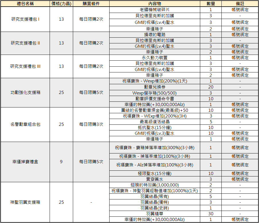 1. 本活動販售之部分商品有綁定、購買次數、等級、使用期限等限制,請留意公告內文及表格中說明。