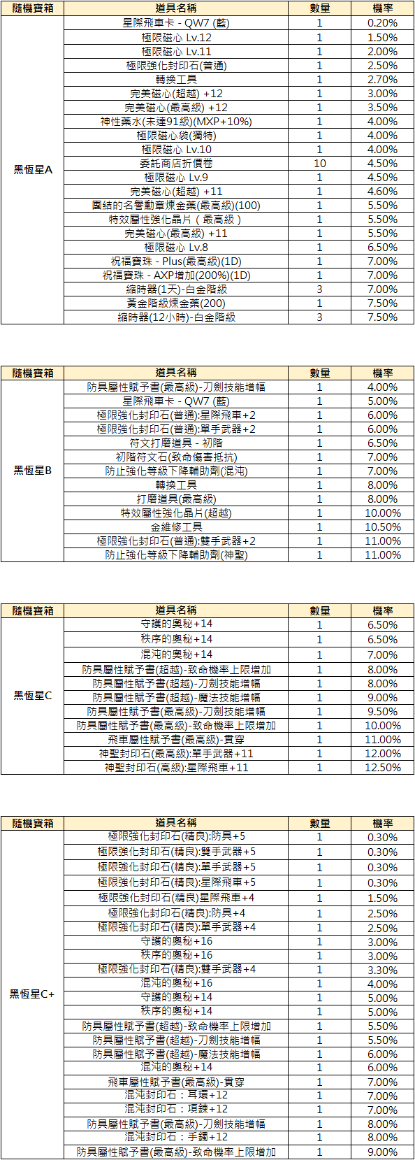 ●黑恆星隨機寶箱內容