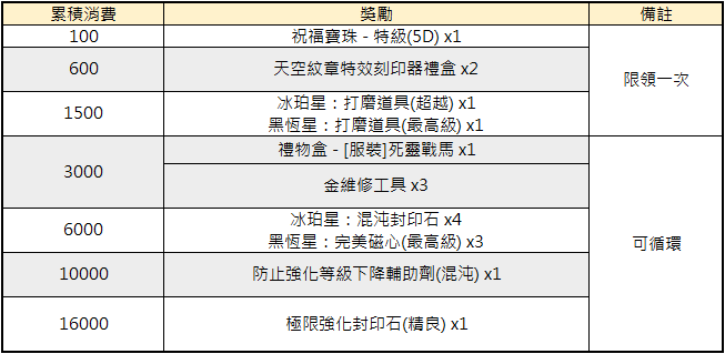 4. 消費金額超過16,000以上時,將從消費3000黑魂獎勵重新開始循環。例如:若某玩家消費達19,000黑魂,將可領取3000黑魂獎勵兩次,其餘獎勵一次。