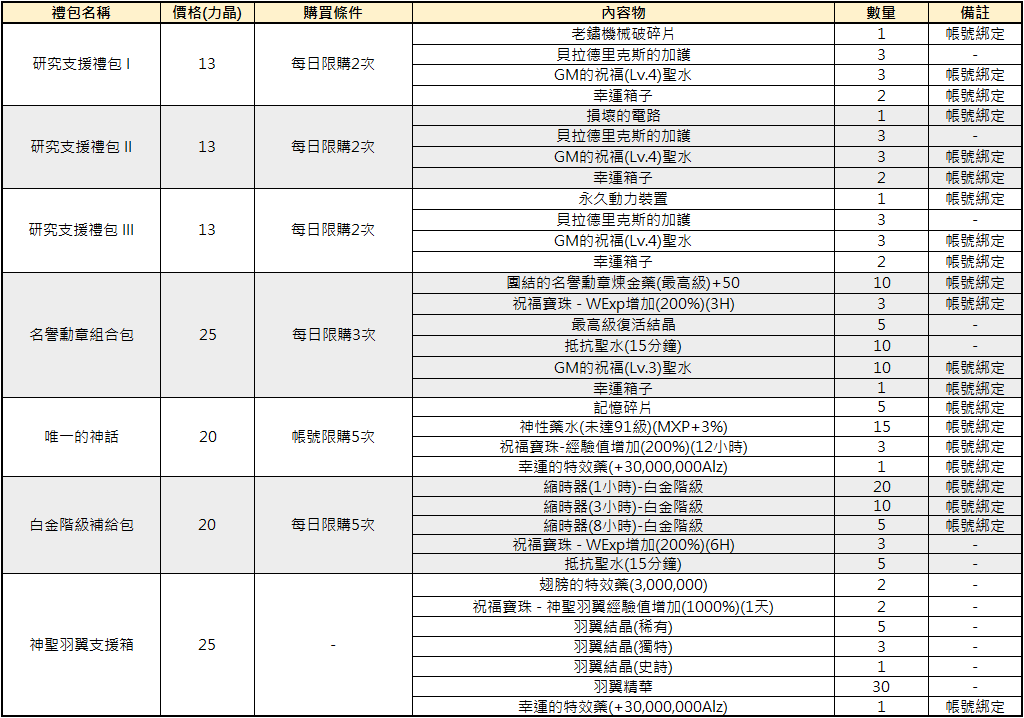 1. 本活動販售之部分商品有綁定、購買次數、等級、使用期限等限制,請留意公告內文及表格中說明。