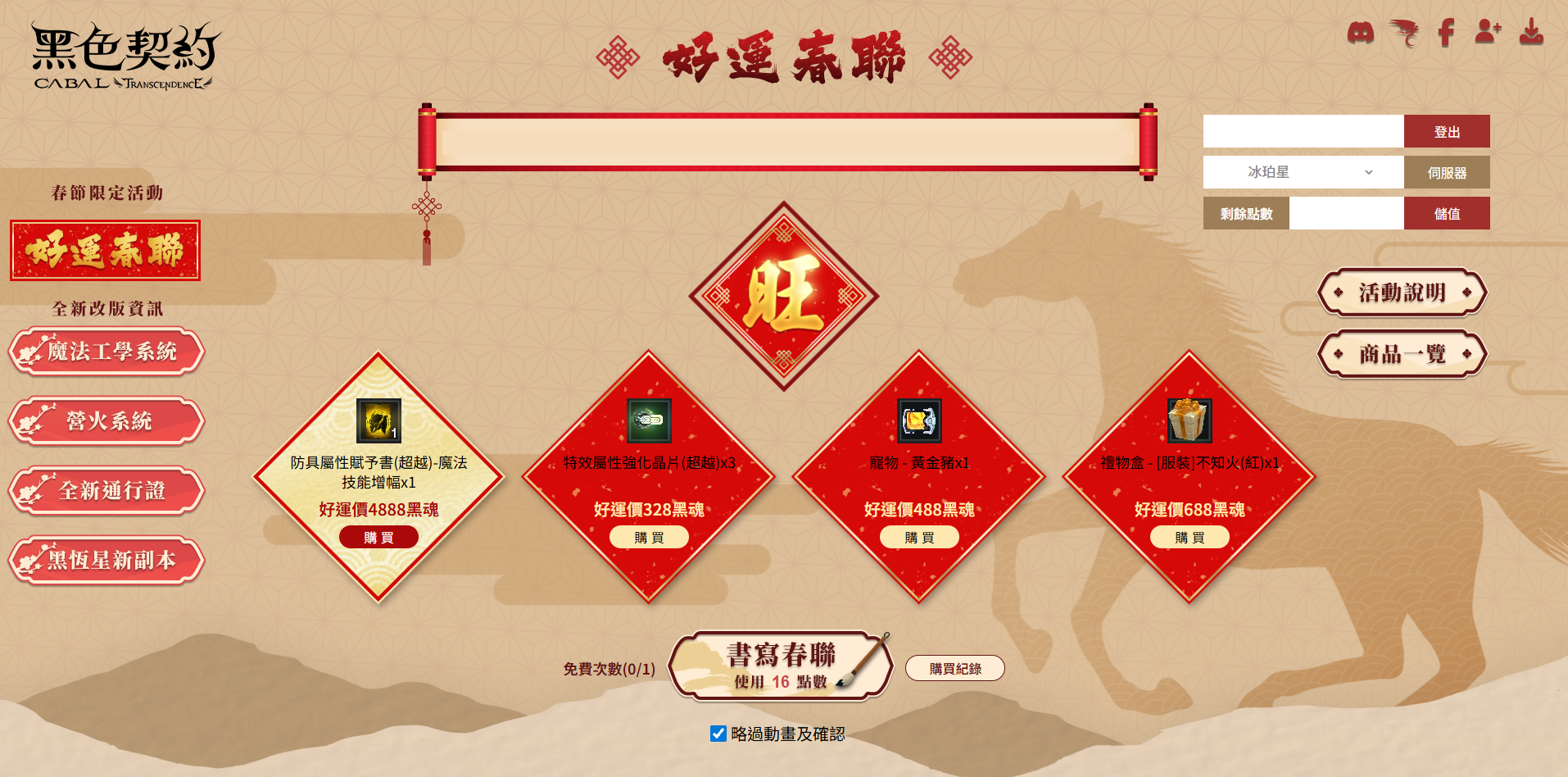 1. 活動期間內,每日可免費獲得一次書寫春聯的機會,每次可抽出4個商品,每日免費次數為0時,可消耗16點黑魂再次進行書寫(不限次數)。