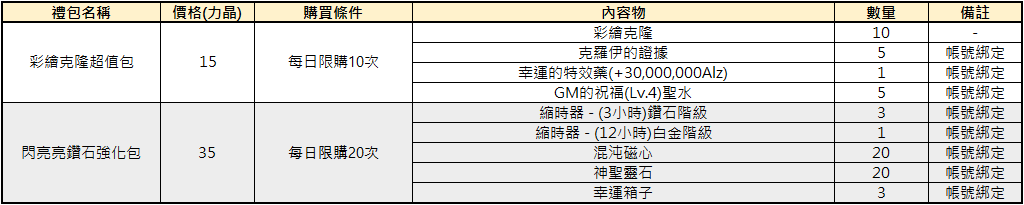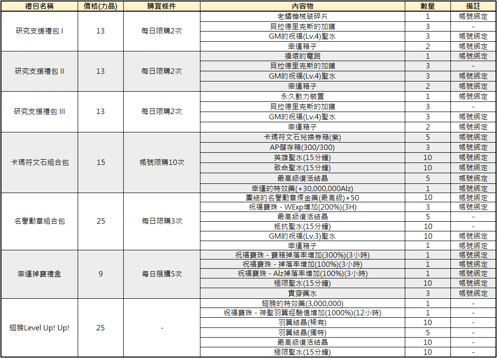 1. 本活動販售之部分商品有綁定、購買次數、等級、使用期限等限制,請留意公告內文及表格中說明。