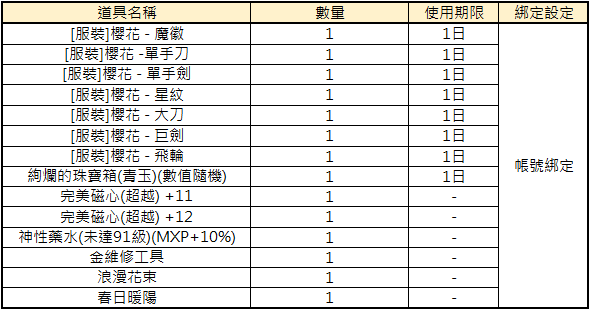 1. 未使用的活動道具「櫻花朵朵開」、「浪漫花束」、「春日暖陽」將於2026/04/07(二) 中午12:00維護後統一刪除,請戰士們把握時間盡速兌換及使用完畢。