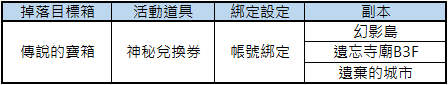 活動期間內,完成指定副本可從傳說箱子開啟獲得「神秘兌換券」。