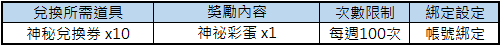 1. 「神秘兌換券」、「神秘彩蛋」為活動性質道具,若未於活動期間內使用完畢,視同放棄權益,將於2026/05/06(三) 維護期間由系統統一回收。