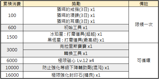 1. 活動期間內,於契約小舖、CASH SHOP消耗遊戲點數(黑魂)購買除了VIP、商品券以外的商品,並累積消費達指定黑魂時,即可前往「領獎專區」領取獎勵。