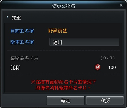 點擊「更改寵物名稱」即可花費100點紅利(或使用寵物命名卡道具),幫你的寵物命名。