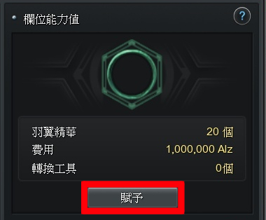 選擇欄位後,點選「賦予」按鈕,可消耗「羽翼精華」與Alz賦予插槽隨機能力值。