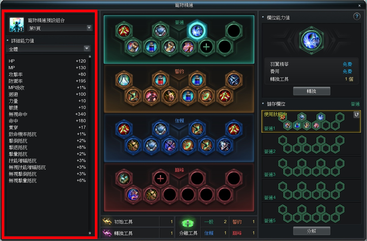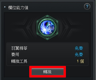 選擇已賦予能力的插槽,點選「轉換」按鈕,可消耗「轉換工具」,隨機轉換該插槽能力值。